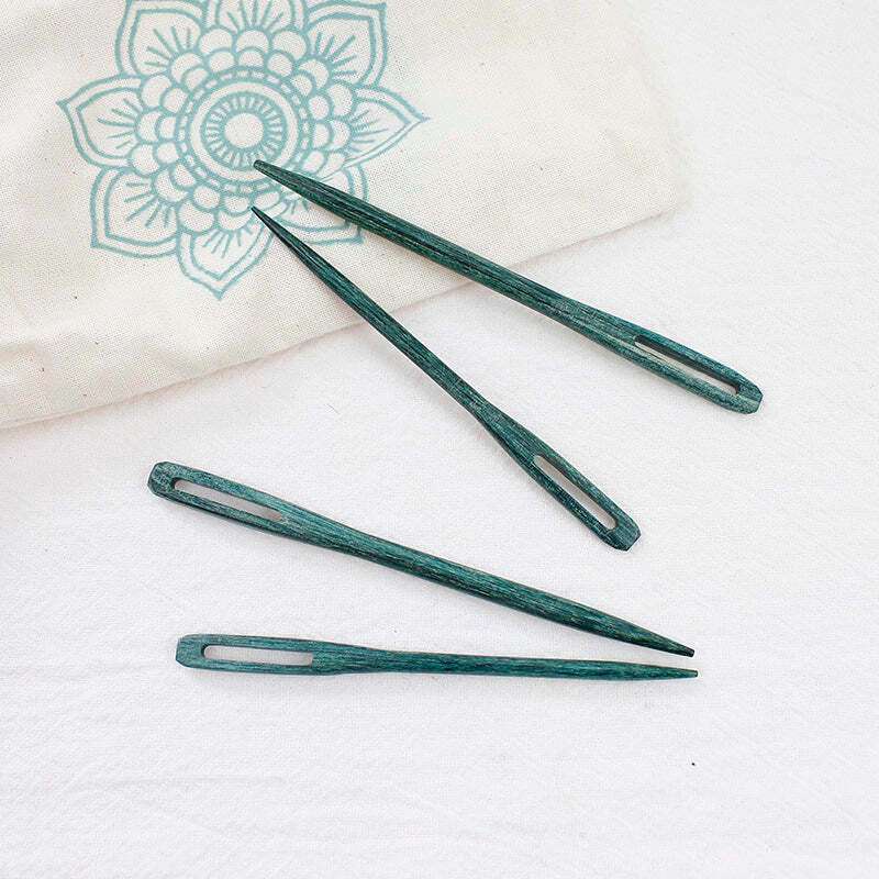 Set de agujas de zurcido en color teal, fabricadas en madera laminada de alta densidad.