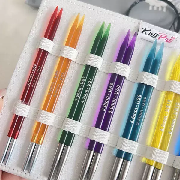 Este es el set perfecto de agujas intercambiables para quienes disfrutan de los colores vivos y de la superficie lisa y pulida de las agujas acrílicas. Contiene 8 pares de puntas intercambiables, junto con 4 cables giratorios de acero inoxidable recubiertos en nailon negro (60, 80(2) y 100 cm) y todos los accesorios necesarios. Todo se presenta en un elegante estuche de tela gris, versátil y práctico para organizar y transportar tus herramientas de tejido.