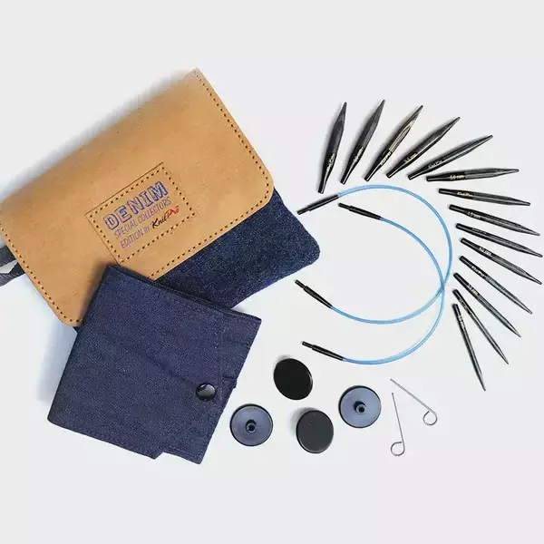 El conjunto viene presentado en un estuche resistente y de aspecto natural, confeccionado en papel lavable y mezclilla (denim), ideal para mantener tus agujas y accesorios organizados, guardados y listos para acompañarte a donde vayas.